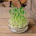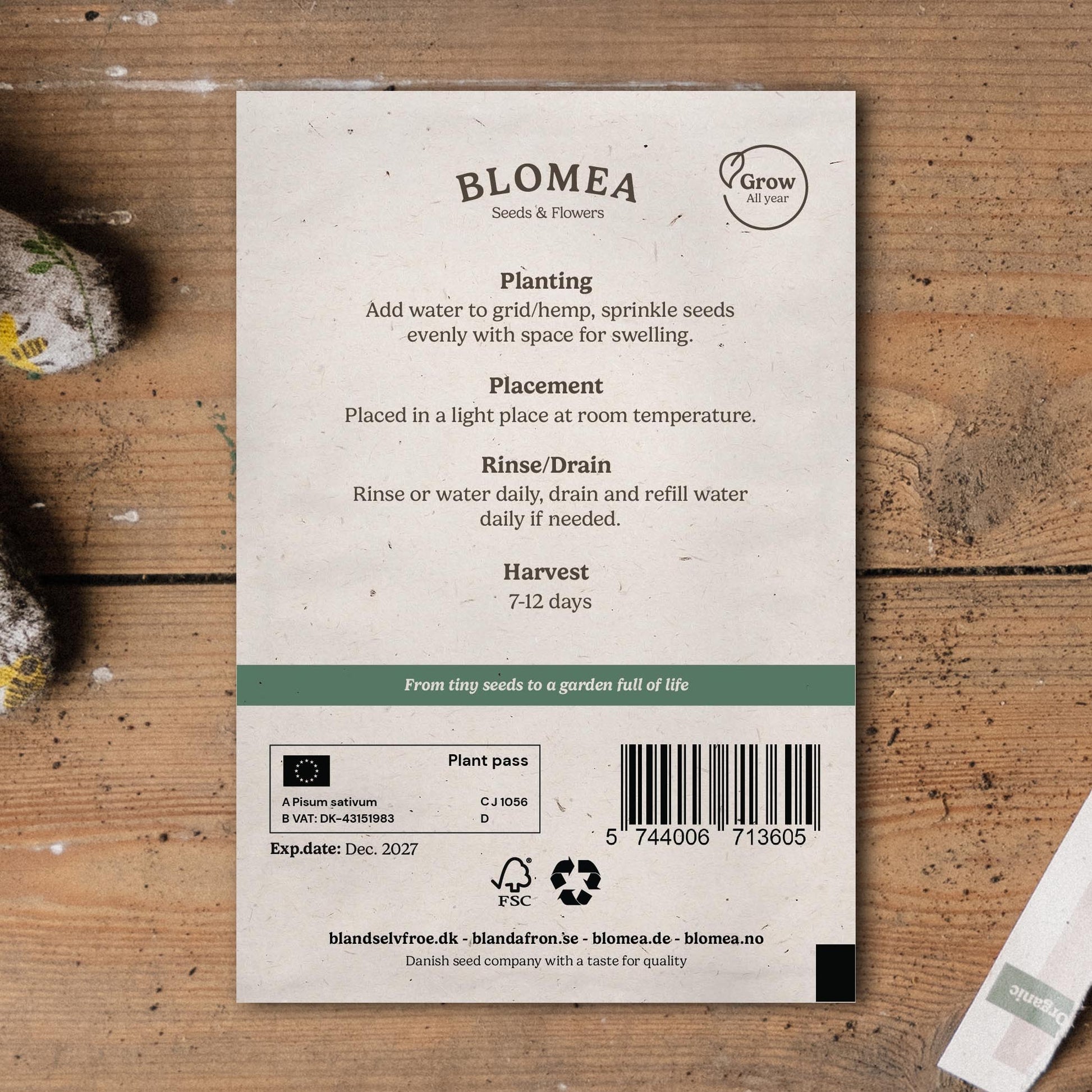 For at dyrke mikrogrønt frø 'Green Peas' bør du starte med at finde en lav skål eller bakke og fylde den med vat. Spred frøene jævnt ud over vattet, og vand dem let. Placér bakken et lyst sted, og hold vattet fugtig. Du kan også anvende vores spireskål. Efter 7-14 dage kan du høste de sprøde, grønne skud og nyde dem i salater eller som pynt på retter. God fornøjelse!