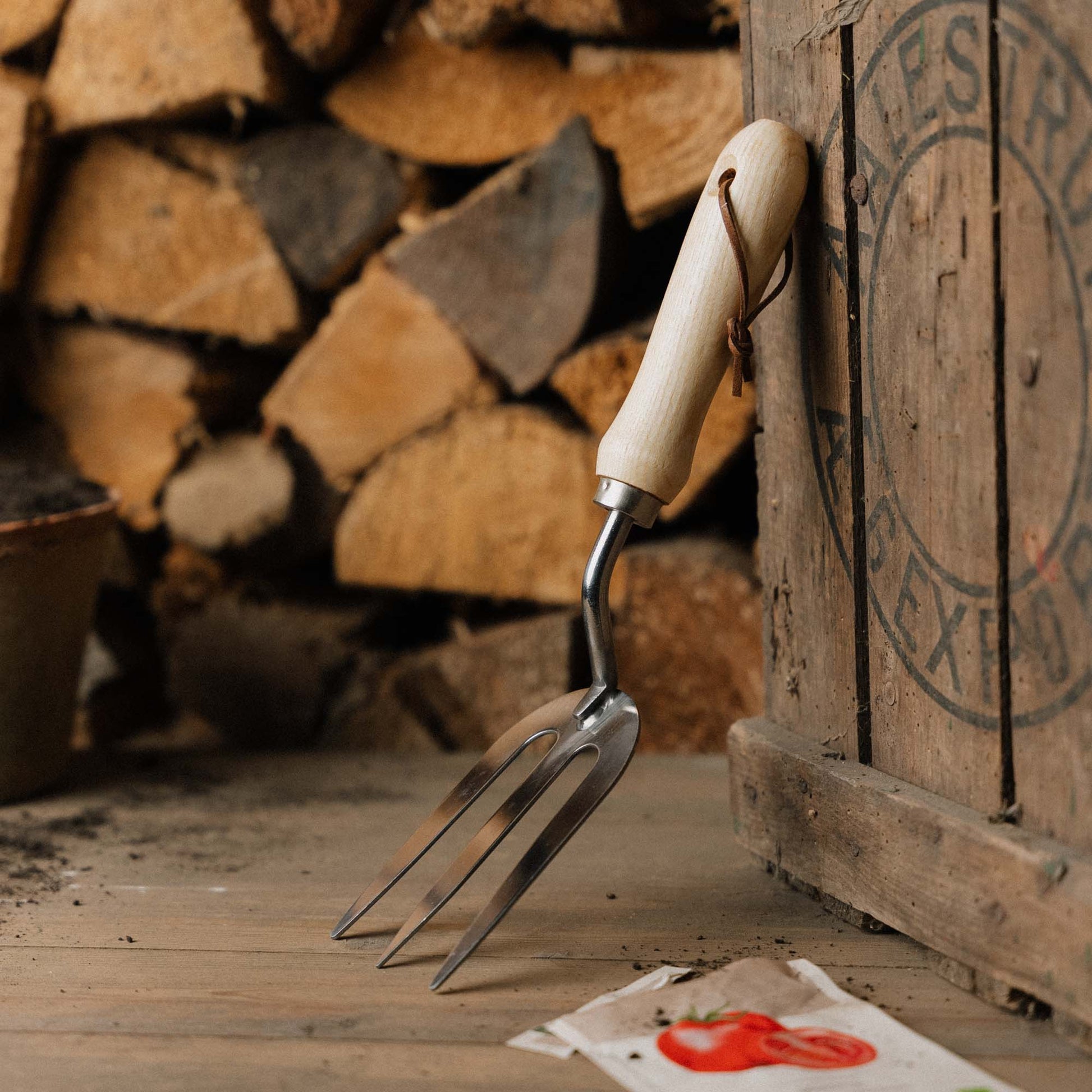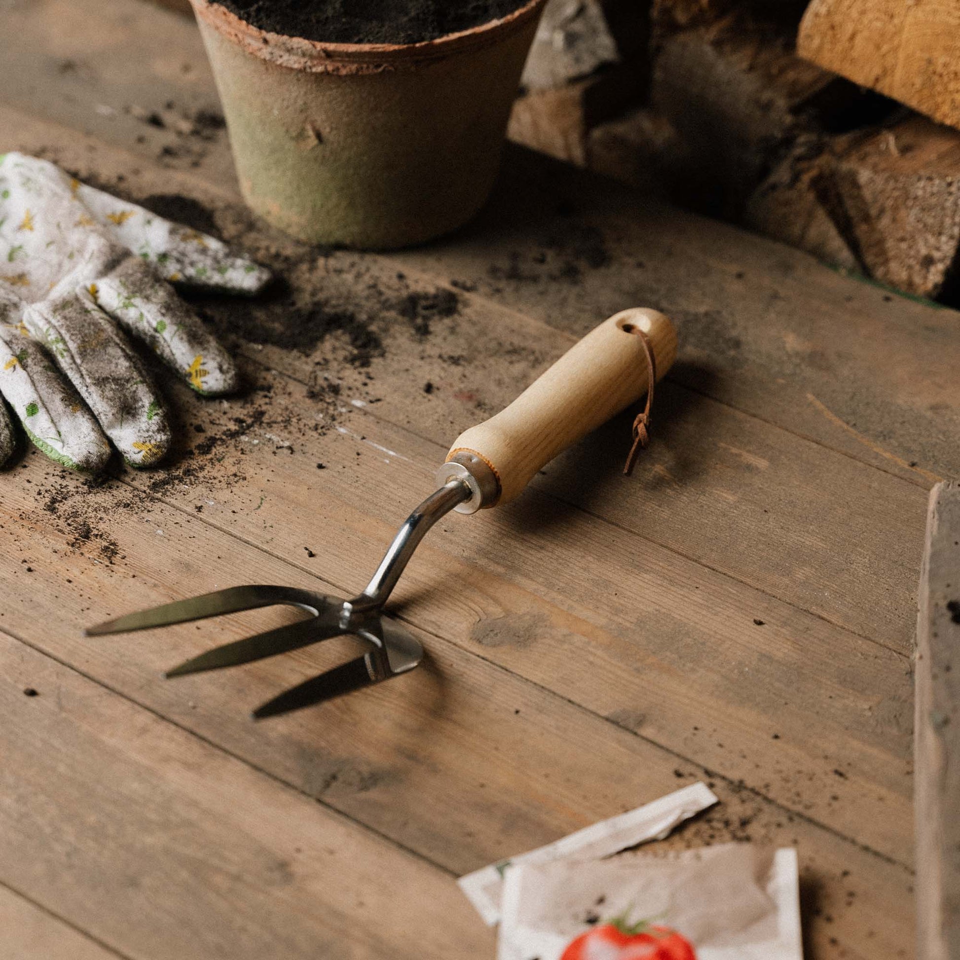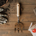 Istutushaarukka on valmistettu ruostumattomasta teräksestä ja puusta.