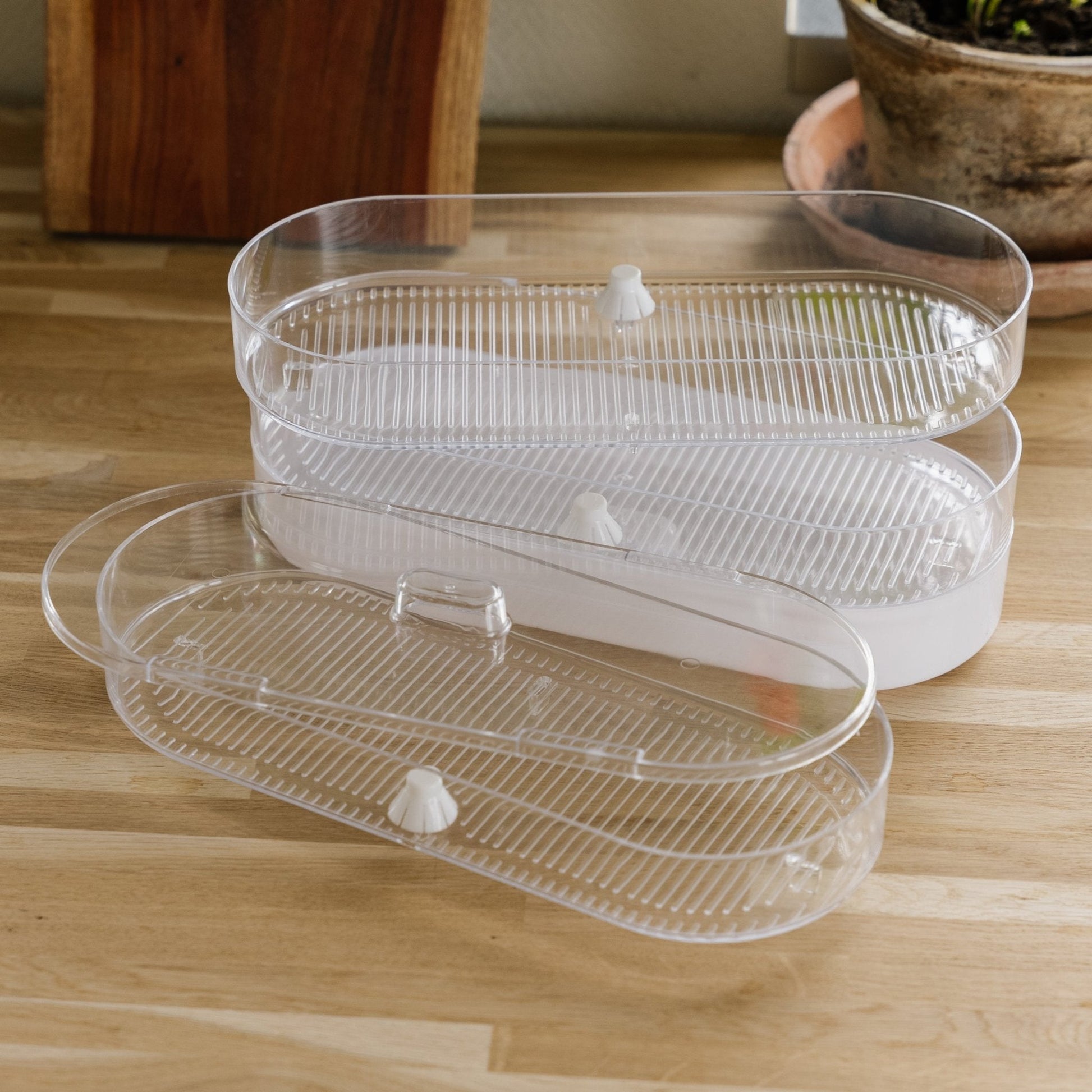 - Daglig pleje: Skyl frøene 2 gange om dagen med rent, koldt vand. Hæld vandet forsigtigt i øverste bakke – det fordeler sig automatisk ned gennem lagene. Tøm bundbeholderen for vand efter behov.