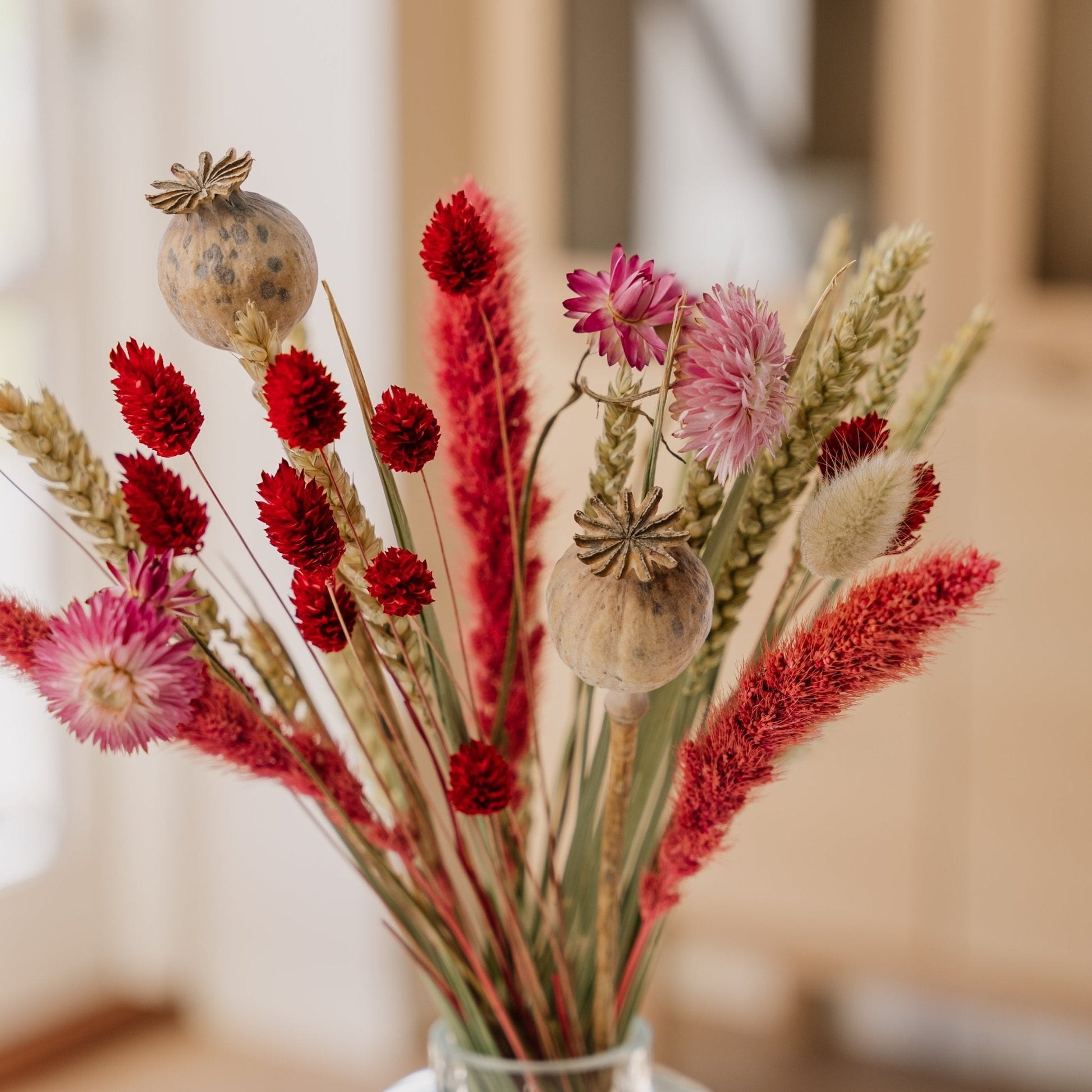 Anna kodillesi lämpimän viehätyksen kosketus Kuivakukkakimppu Rosa – eloisa yhdistelmä kirkkaanpunaisia heinäsirkkoja, herkästi vaaleanpunaisia strawflowerseja, koristeellisia unikkakapselia ja kultaisia viljanvarsia, jotka pysyvät kauniina jopa 12 kuukautta ilman vettä tai hoitoa.