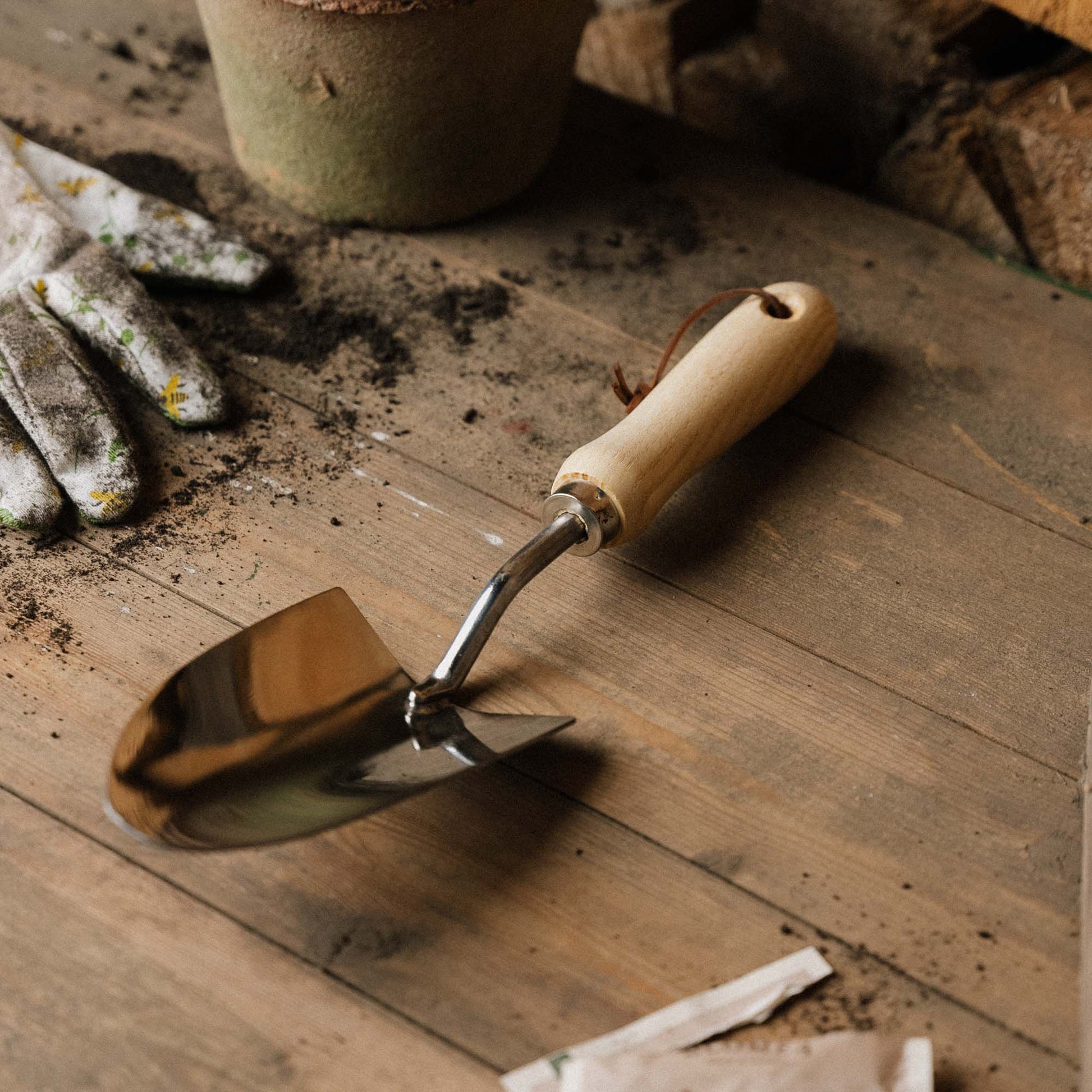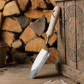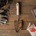Leveä istutuslapio on valmistettu ruostumattomasta teräksestä ja puusta.